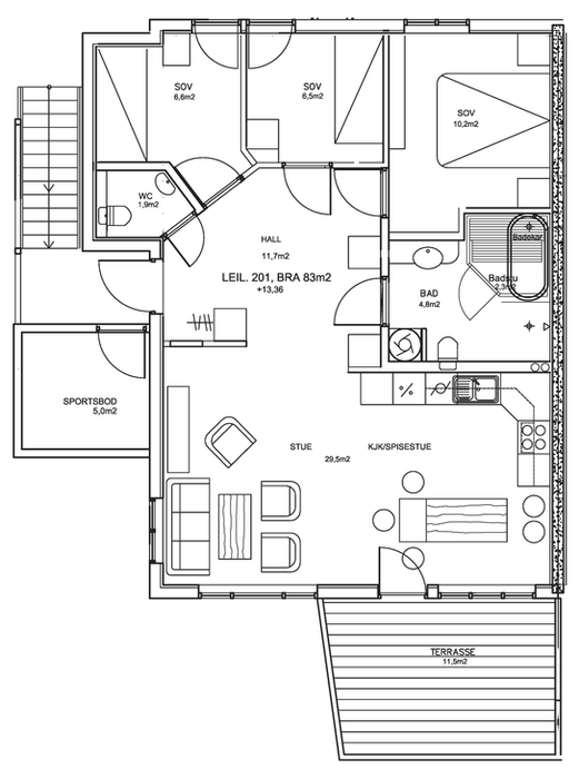 4 roms beliggende i 2. etasje ved byggets vestside med flott utsyn mot skibakken mot vest og området fremover mot syd. Stor stue med hjørnekjøkken og god plass til spisestue og sofaseksjon. Baderom med mulighet for badekar eller badstue etter ønske (tilvalg). 3 gode soverom i bakkant og et separat toalett med servant. Stor sportsbod med strømuttak på utsiden av inngangsdøren. Denne leiligheten finnes speilvendt, leilighet 204.