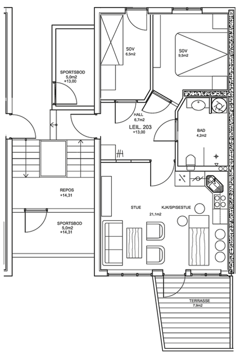 Flott 3-roms med stor, solrik uteplass. Hjørnekjøkken og god plass til spisestue og sofaløsning. Romslig baderom med opplegg for vaskemaskin, servant, toalett og dusj. To gode soverom, vendt bakover med god plass til skap for oppbevaring. I tillegg har leiligheten en sportsbod med strømuttak ved inngangen. Denne leiligheten finnes speilvendt, nummer 202.